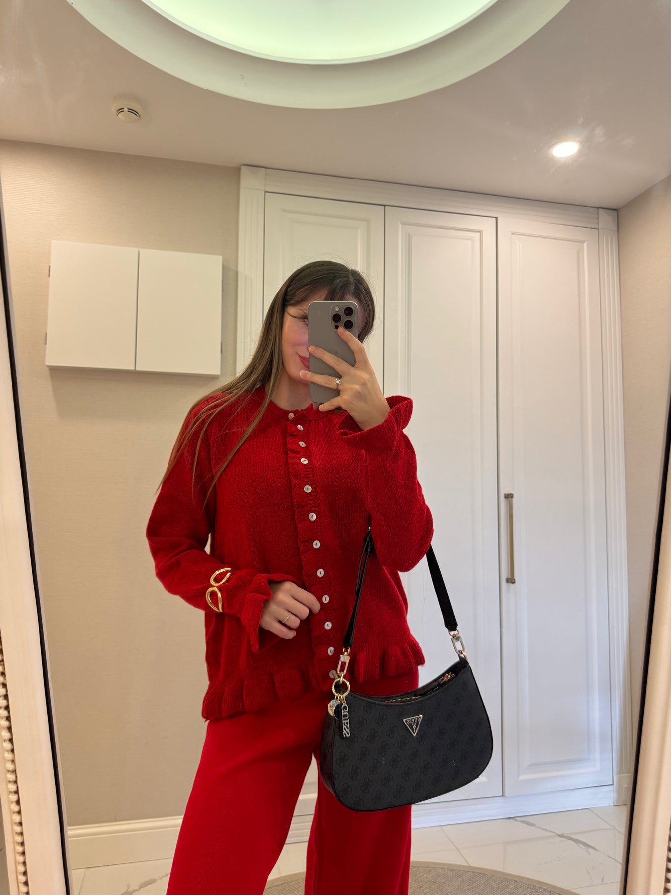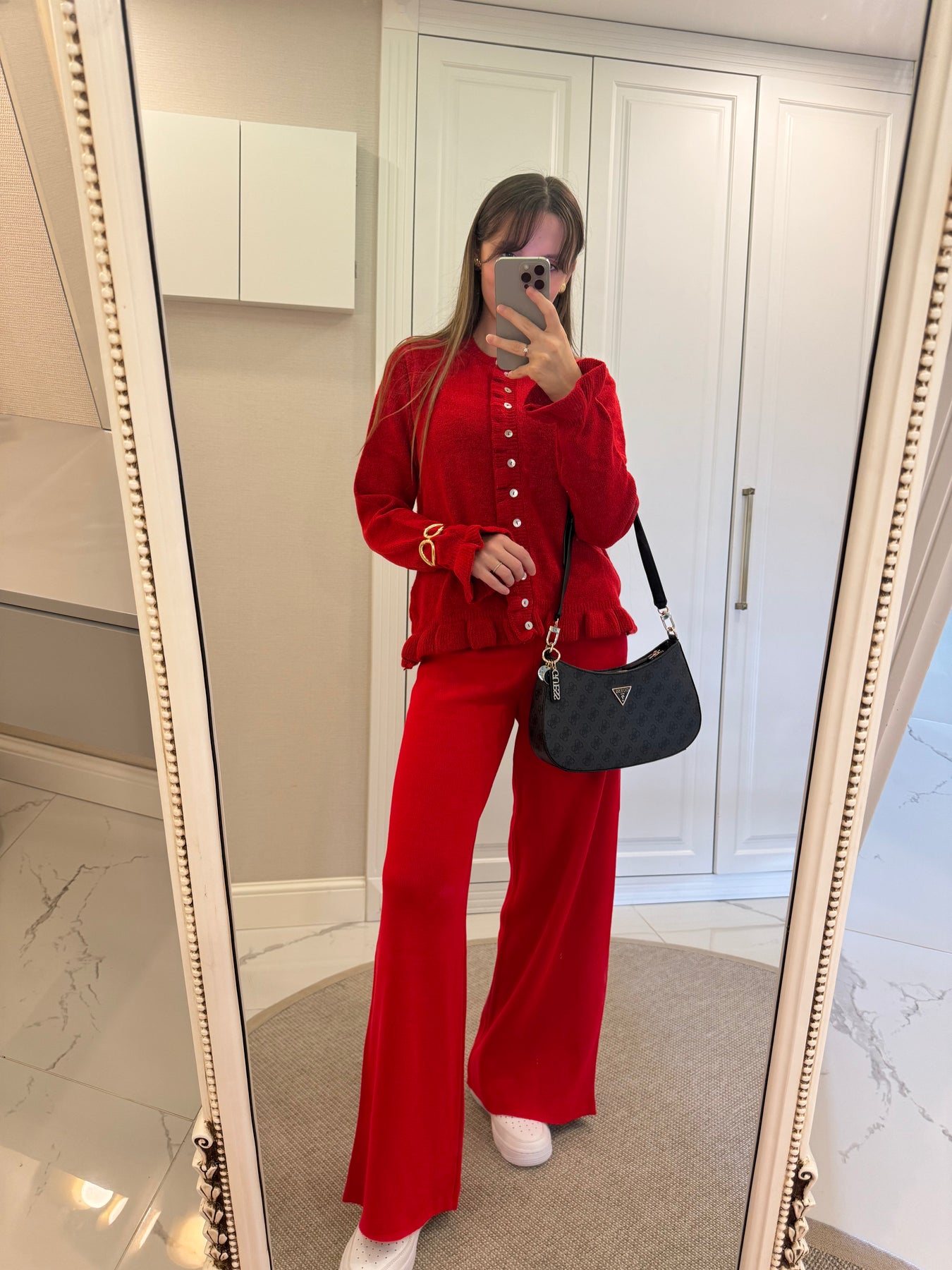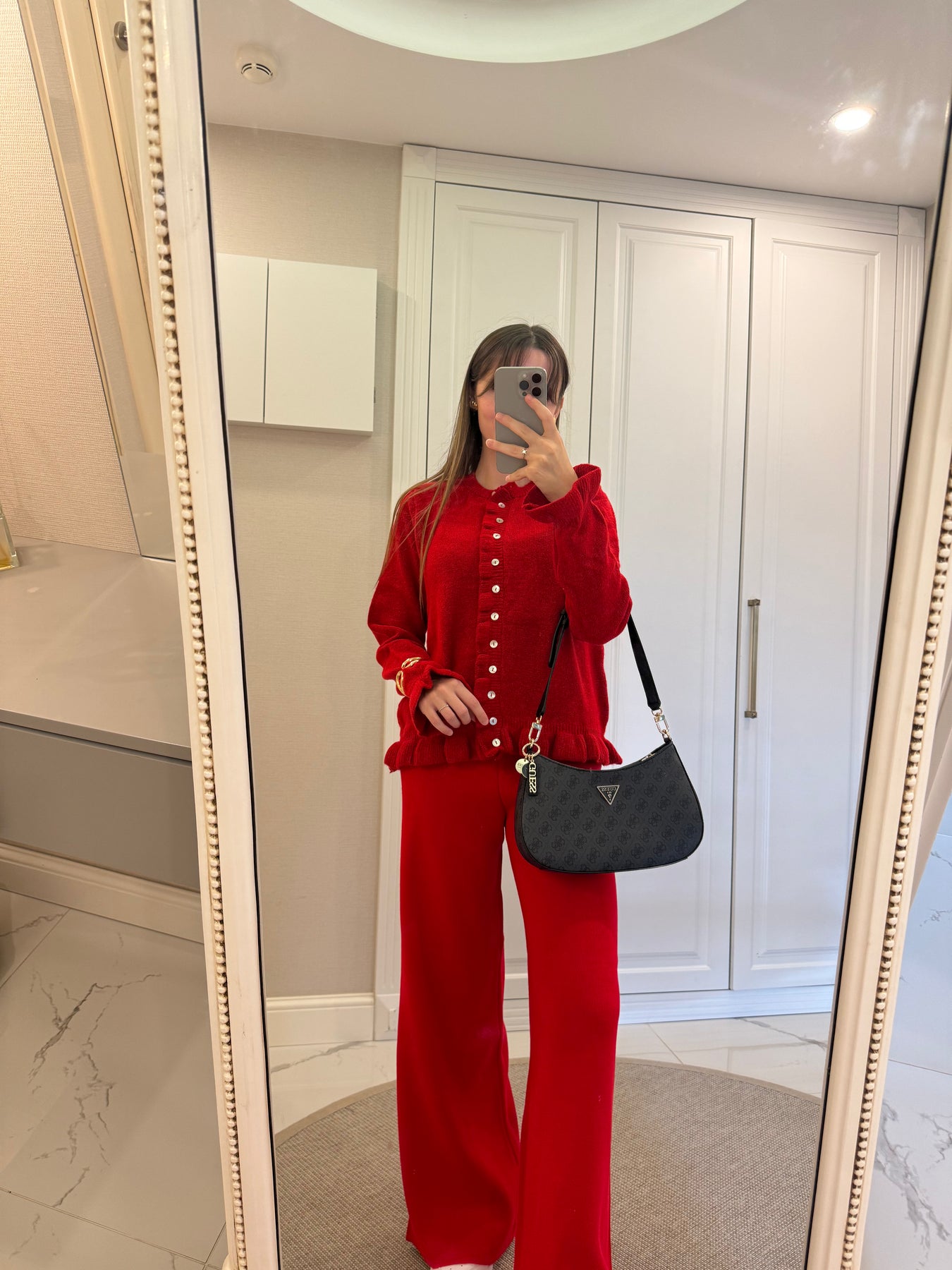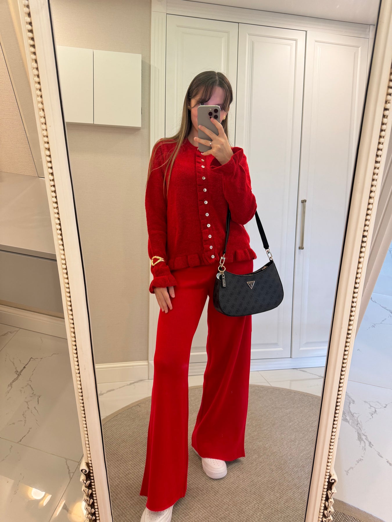 Kombin edilen kırmızı triko pantolonu alt giyim sekmesinden bulabilirsiniz.